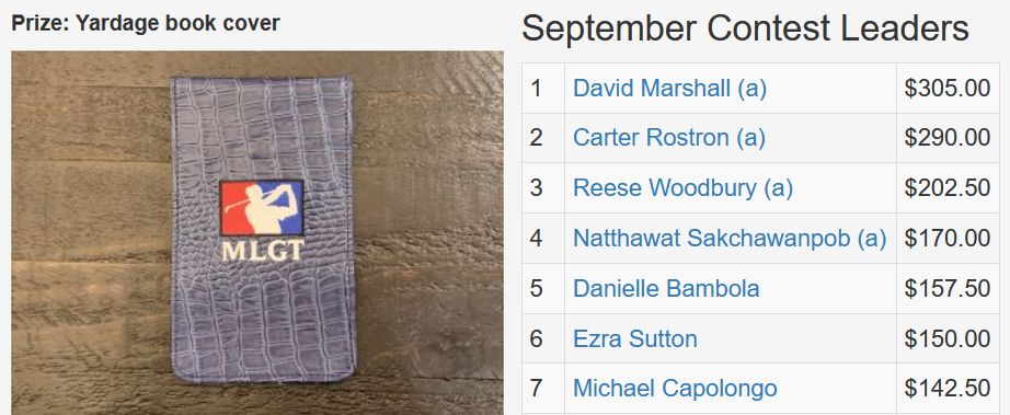 BACK for 2021...the leading money winner every month will win a prize ranging from MLGT swag to a free entry into the regular division to play with the professionals. September's prize is a MLGT leather yardage book cover. Here is how we stand with 2 TD events left in September.