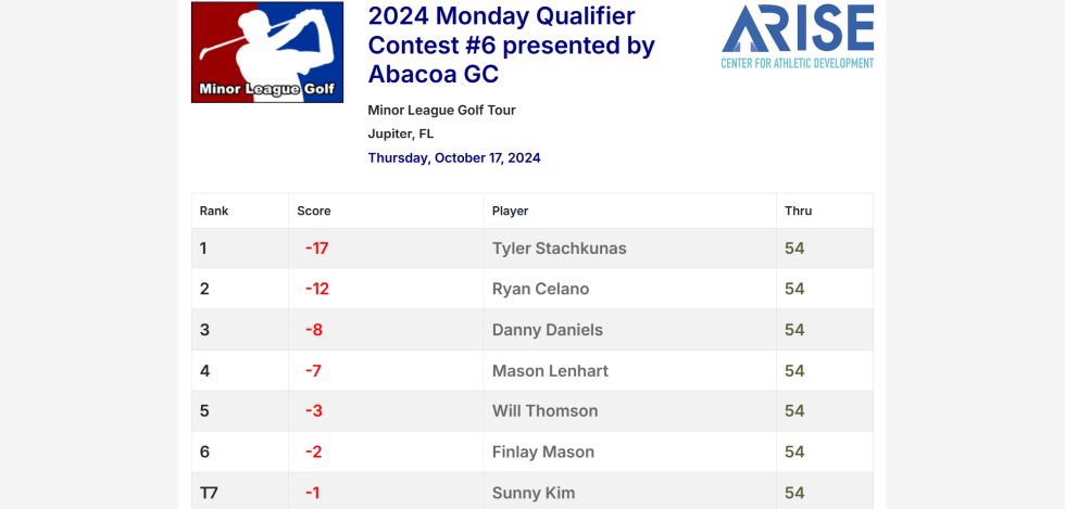 Tyler Stachkunas of Lake Worth, FL wins 2024 Monday Qualifier Contest #6 presented by Abacoa Golf Club with a 3-event cumulative score of 196 (66-60-70). The contest consisted of the three 1-day events played this week at Abacoa GC, Atlantic National GC and Fountains CC.